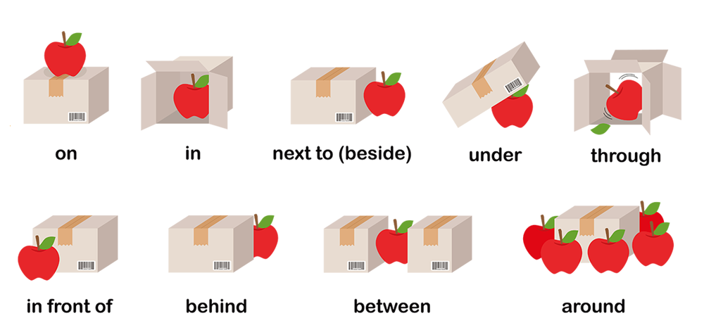 方向を示した後に、目的地の位置を具体的に教えてあげましょう。前置詞に抵抗がある人も多いかと思いますが、下記のような画像でイメージするとわかりやすいですよ。