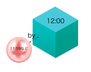 時間にもbyは用いられます。「〜までに」と期限を表すbyですが、これは、11時50分や11時59分など、とにかく「12時という時間」のそばの、「ある時間までに」戻らなければならない、というイメージで捉えることができます。