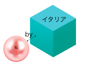 「〜を経由して」「〜を通って」と訳すby。よく旅行英会話などでは使われる表現です。これも「私(I)」が「イタリア(Italy)」のそばを通過したというイメージを持つことができますよね。