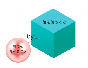 「by 〜ing」というようにbyの後ろに動名詞を伴うことで「〜することによって」と訳すbyの用法。これも便利で、頻繁に使われます。この場合も、「箸を使うこと」という概念と、「寿司を食べる」ということが「by」によって密接になり、そばにあるというイメージで捉えることができます。