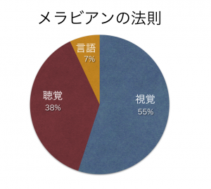 またその後、米国の心理学者アルバード・メラビアンは「第一印象は出会って数秒で決まり、その第一印象の判断に使われる要素は、視覚が55%、聴覚が38%、言語が7%である」という研究結果を発表しました。これを「メラビアンの法則」といいます。