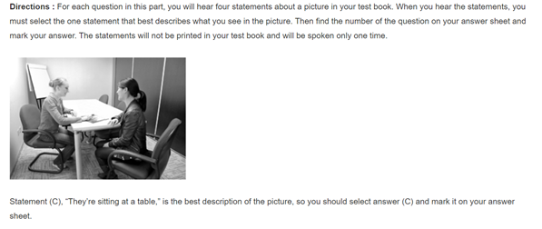 part1「写真描写問題」のパート。問題用紙には、設問に関する写真が印刷されています。受験時には、選択肢がA〜Dまで4つ音声で流れてくるので、最も正しく写真を描写しているものを1つ選択しします。具体的には「誰が何をしている」「何がどう置かれている」といった設問があり、正しい描写をしている英文を選びます。
