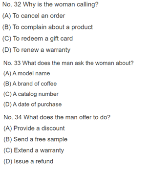 設問分も解答の選択肢もまったく記載されていないPart2とは異なり、part3では下記のように設問文と選択肢が問題用紙にすでに印刷されています。設問文と選択肢を読めば、「どのような会話がされるのか」「会話のなかから何を聞き取るべきか」が、おおよそわかりますね。