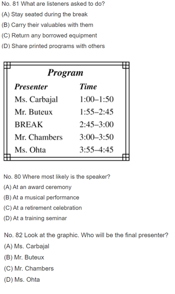 1つの質問に3つの選択肢が放送され、正しいものを1つ選択する