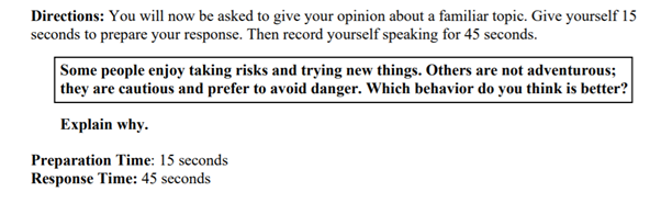 Question1は、Independent taskです。課題に対して自分の立場から根拠を示しながら意見を述べます。Agree/Disagreeで回答できる問題・Preferenceで好みを答える問題・提示された意見に対して良い・悪いを問う問題がよく出題されます。