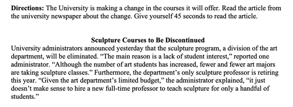 回答は、In her opinion, eliminating the sculpture class is a big loss for the faculty and the change is too drastic. If they don’t have the budget, they can hire a part-time professor or a professor who can also teach sculpture.などと始めるとよいでしょう。