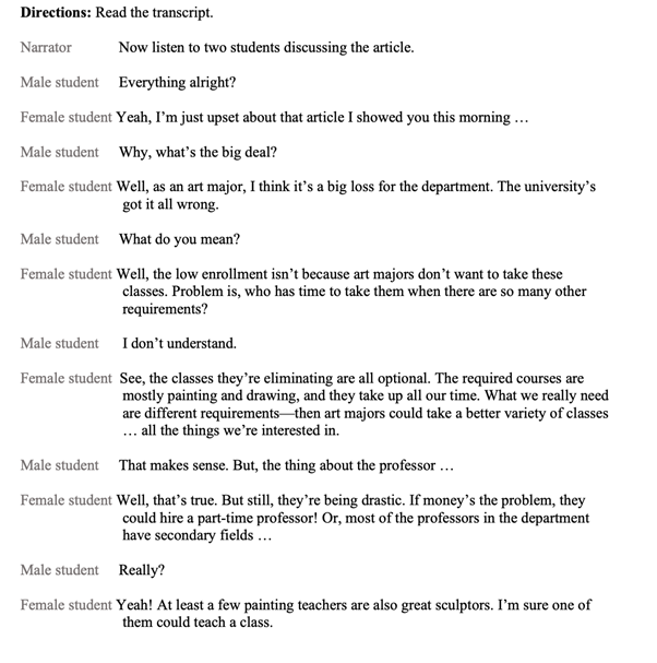 Question2では、文章を読んだのち、会話文の音声を聞いて回答に移ります。会話文の人物の主張をしっかり聞き取ることがポイントです。