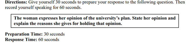 TOEFL iBTスピーキングは、4つの設問で約15分間あります。回答は録音されますが、制限時間が設けられており、制限時間内に録音された回答だけが評価の対象になります。