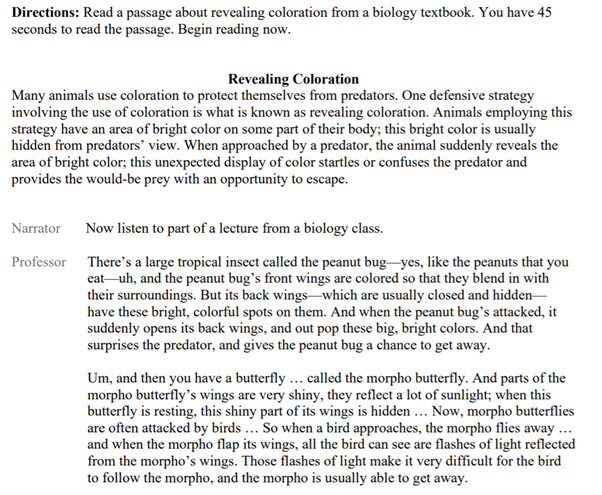 Question2~3はIntegrated taskです。文章を読み、音声を聞いて、2つの情報を要約する問題が問出題されます。