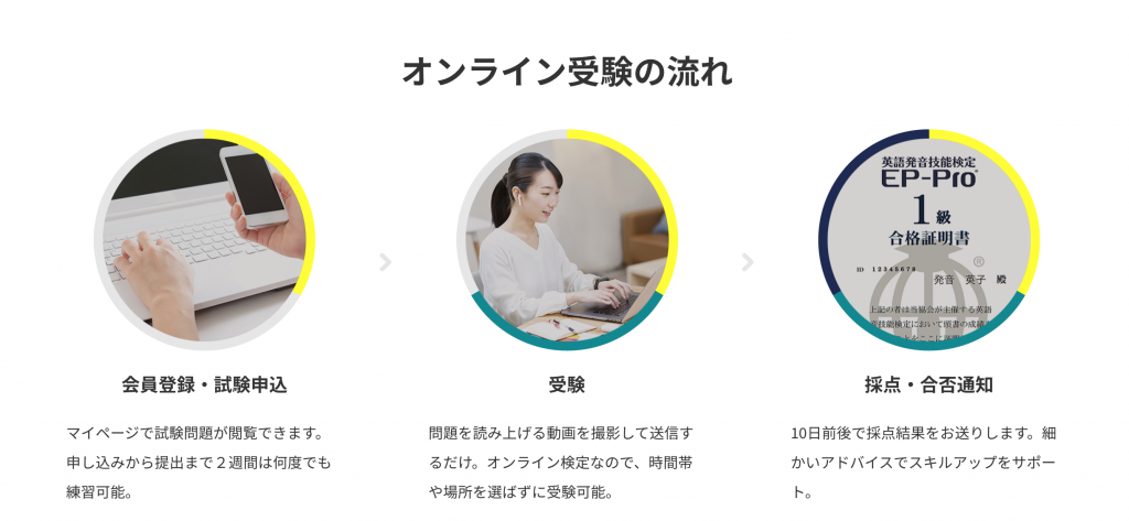 試験は動画を撮影して送信するという形式ですが、試験問題が事前に閲覧でき、申し込みから提出まで2週間何度でも練習ができるので、これを機に集中的に発音にこだわった練習ができるというのもいいところです。