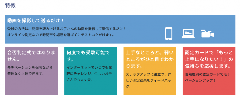 EP-Proの子供向けテストがこちら。フォニックスのルールに基づく正しい発音を習得しているかを測定するテストで「きちんと通じる」発音が身についているかを客観的に測ることができます。