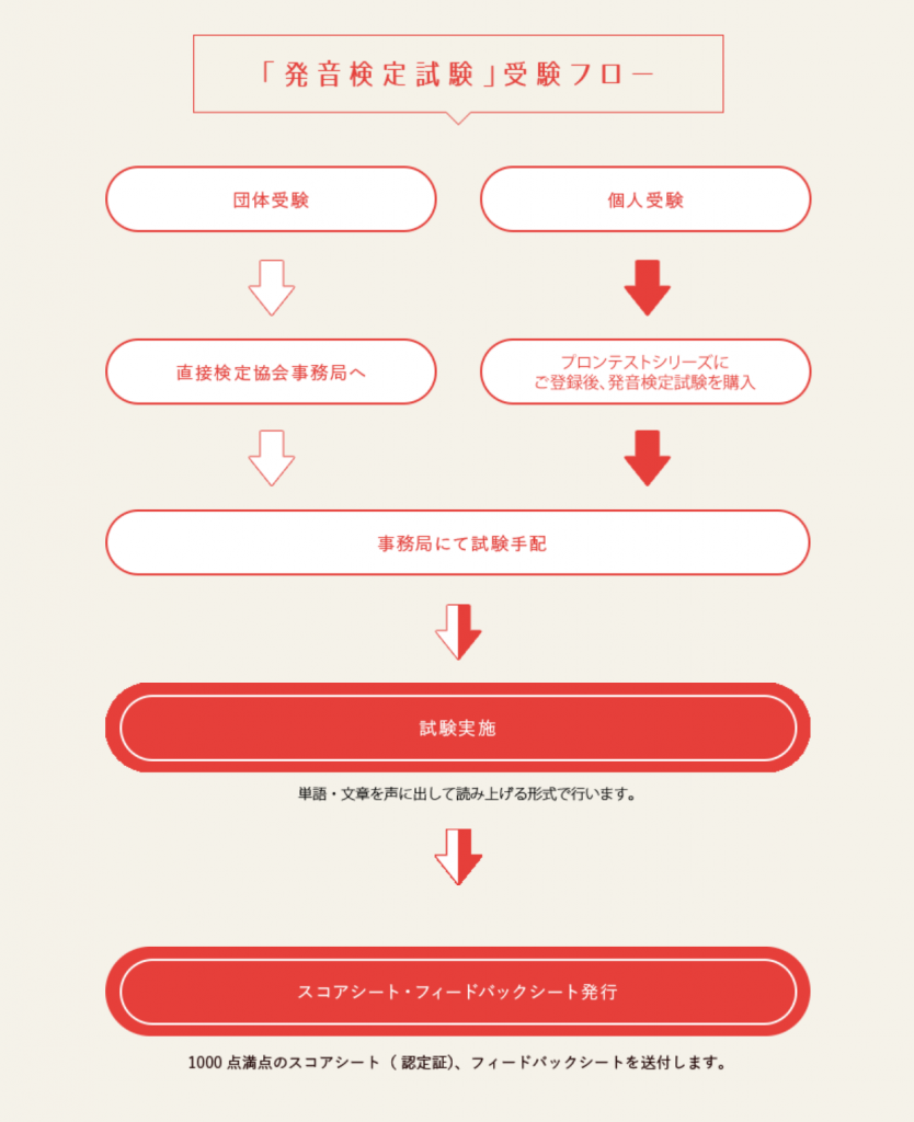 国際発音検定協会のHPによると、「世界初の学術的根拠(音声学)に基づいた発音試験」とあります。評価ポイントは母音・子音の発音や、リンキング、イントネーション、アクセント、脱カタカナ度など。国立研究開発法人産業技術総合研究所と共同開発した音声分析器技術によって採点されるとあります。