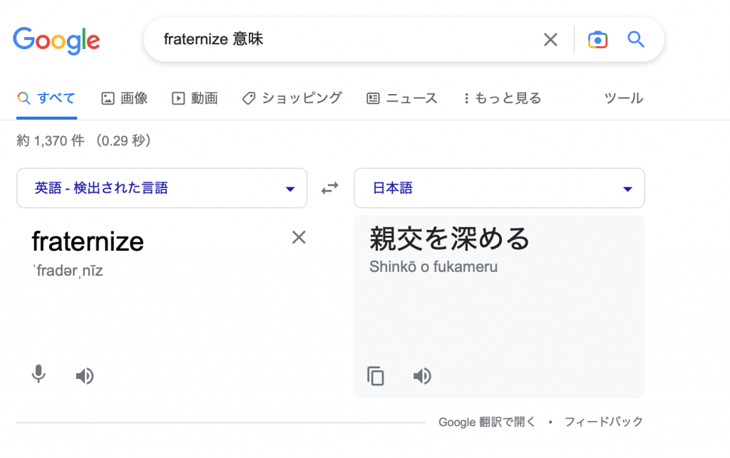 「fraternize meaning」と入れて検索してください。「意味」ではなく「meaning」と入れることがポイントです。するとトップにこのような結果がでてきます。