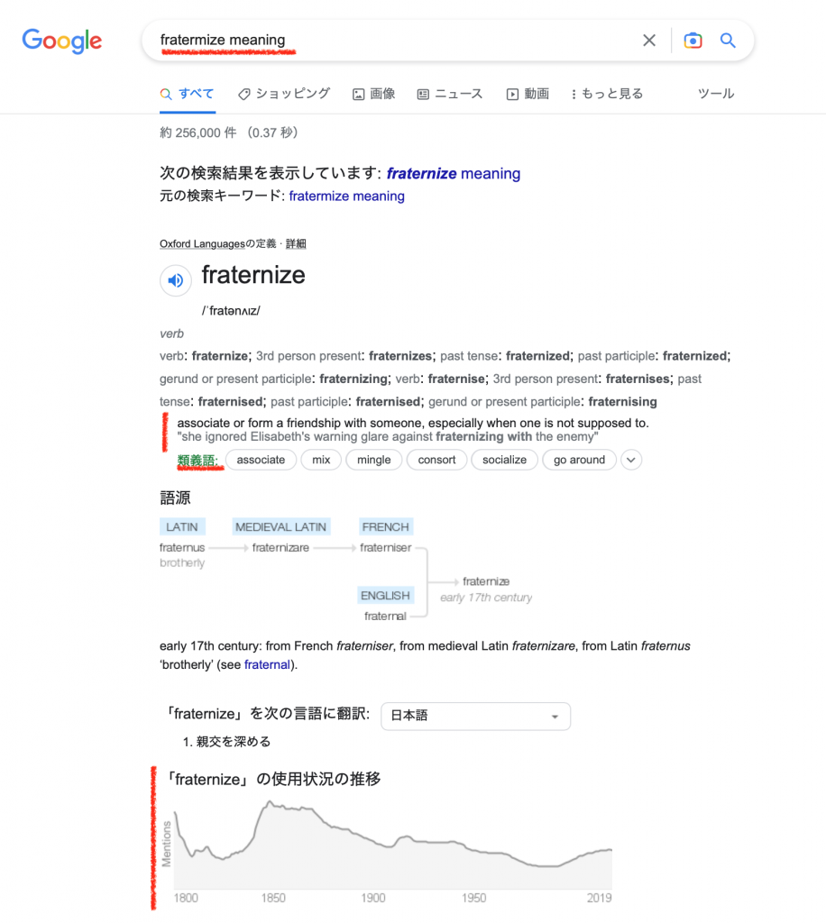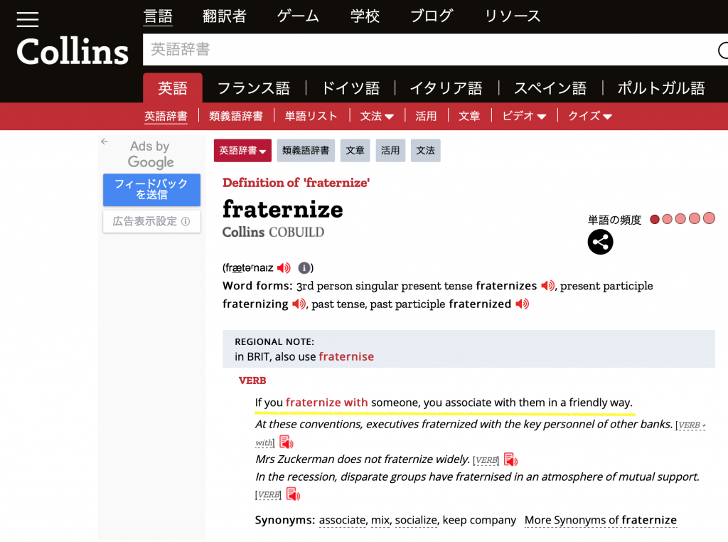 fraternizeの意味や類義語などが沢山でてきます。ここで確認すべきことは下記の4点です。