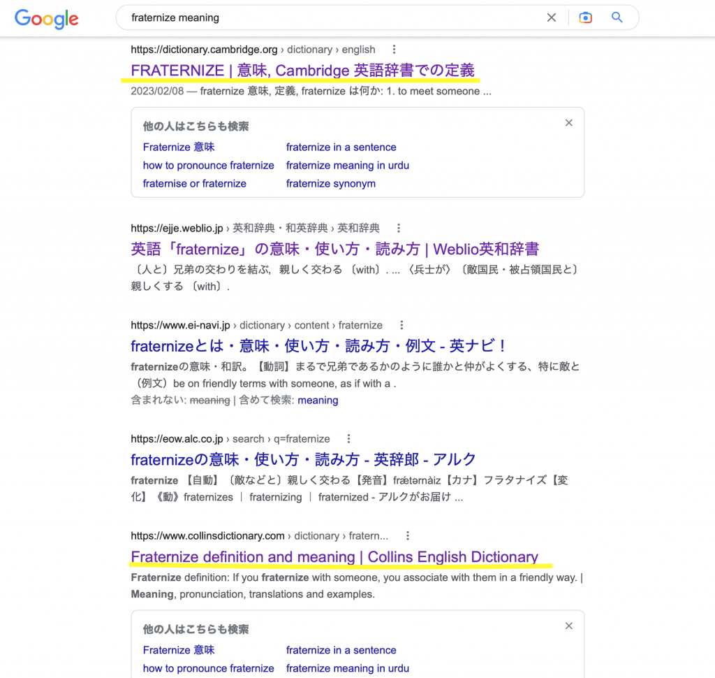 Google検索で先程「fraternize meaning」で検索をしたら、検索結果の上位に、たいてい「Cambridge Dictionary」や「Collins Dictionary」などの有名な英英辞書のウェブサイトが検索結果として上がってくるはずです。