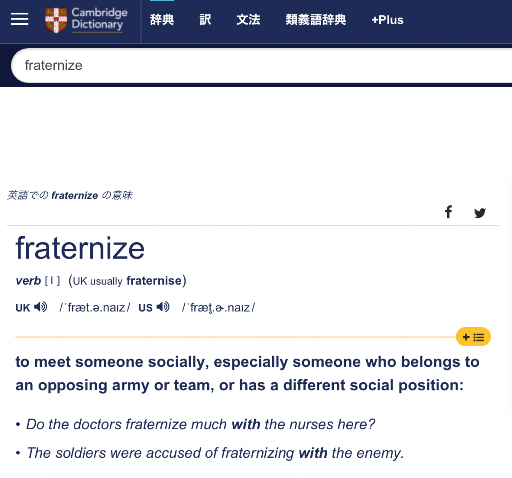 Cambridgeの場合は、このように「fraternize」の意味が説明されています。