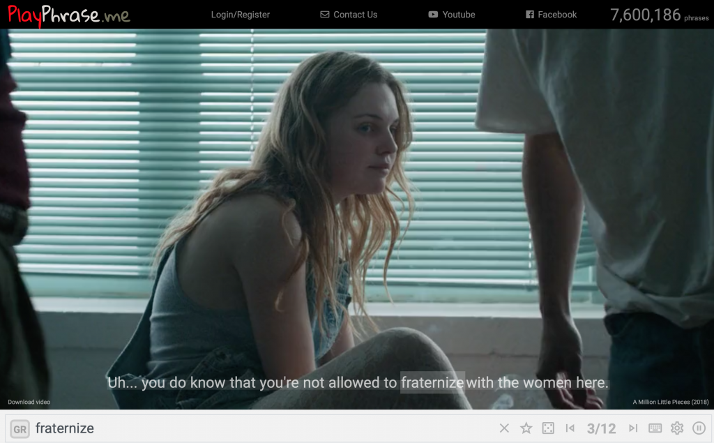 これは、例えば「fraternize」という単語をこのサイトで検索すれば、その単語を含んだ映画のワンシーンのみを切り取って表示してくれるとても便利なサイトです。