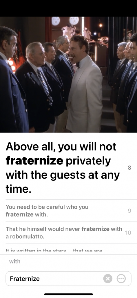 今回ご紹介した方法を使うと、例文や映像や使われた年代など、「fraternize」の周辺にあるいろいろな情報に沢山触れることになります。その過程で非常に「記憶に残りやすく」なります。そしてなにより「どんなシーンで、どういった人がどのように使うのか、という単語の使い方」までがわかるようになります。