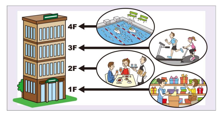 あなたは、あなたの家にホームステイに来た留学生と一緒に旅行をしていて、泊まっているホテルのフロアガイドを 見ています。留学生からの質問に対して、与えられたフロアガイドの情報をもとに、英語で答えてください