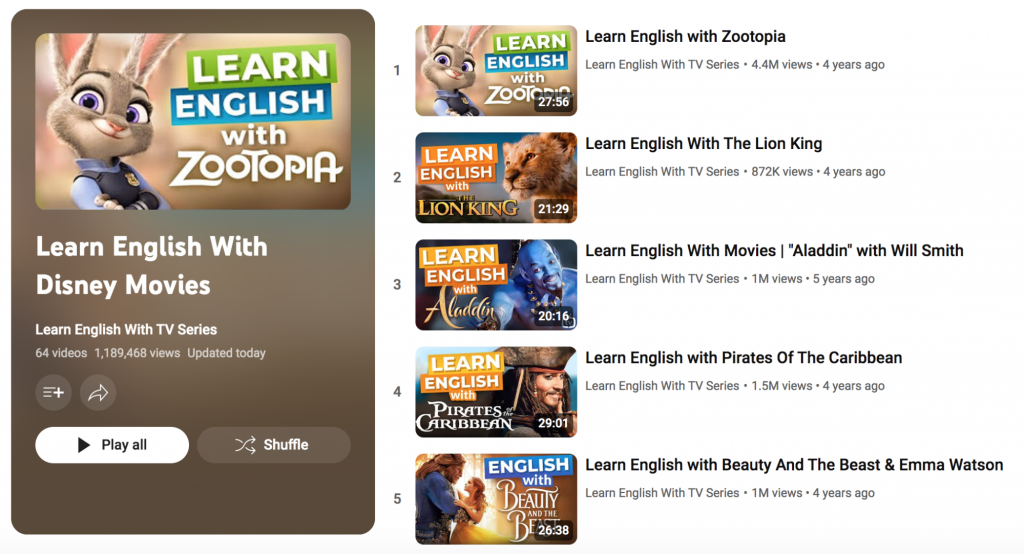 海外の英語学習用YouTubeチャンネルで莫大な人気を誇る『Learn English With TV Series』の中の、ディズニー映画に特化したものです。ディズニー映画は多くの中学生にとって馴染みのあるストーリーや、見たことあるものが多いのではないでしょうか。