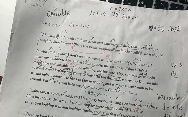 短期留学で担任してもらった先生と、一緒に英語落語を創ってみようと思ったのがきっかけです。スクリプトは自分で創りたかったので、まずはそれを用意するところから始めました。場所を現代のニューヨークにし、主人公を変え、登場人物もスティーブとかジョンとかにして、あらすじだけ残してあとは全部オリジナルです。それを英語に翻訳してから先生に相談しました。「日本の古典落語をやりたいんだけど、これをもっと面白くするにはどうしたらいいだろう」って。つたない英語で「この状況はこうでああで」と補足しながら説明して、どのフレーズがいいかって話し合って。それを朝から晩まで付き合ってもらいました。そうやって出来上がったスクリプトを少しずつ覚えていったんです。
